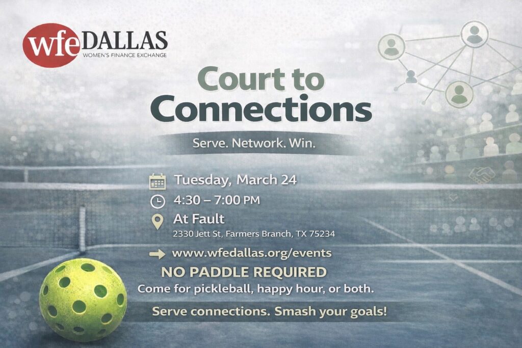 2026-03-24 16:30:002026-03-24 19:00:00America/ChicagoWFE Dallas Women's Finance Exchange Presents "COURT TO CONNECTIONS"https://www.wfedallas.org/event/womens-finance-exchange-presents-court-to-connections-serve-network-win/AT FAULT | FARMERS BRANCH, 2330 Jett Street. Farmers Branch, Texas 75234WFE Dallas Board AssistantPamellanaomi.khong@truist.com